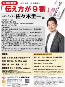 教育講演会は、毎年弊社モリグループ会社社員研修の一環で行っていますので、一部内容に関しても弊社に沿った内容、弊社スタッフも一緒に参加させていただきます。予めご了承ください。